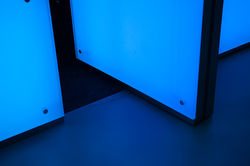 A Cube was selected as a design form because it related to the shape of the entrance portal and the clear lines used to create the interior space. Whilst simple in form, the LED lighting panels allow the cube to transform itself, through colour and light to take on different identities, project different forms and shapes, and create different moods or environments.