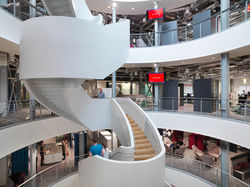 which now floods the floorplates with natural light. Within this space a new flowing helical staircase has been inserted into the newly formed atrium to provide immediate interconnectivity